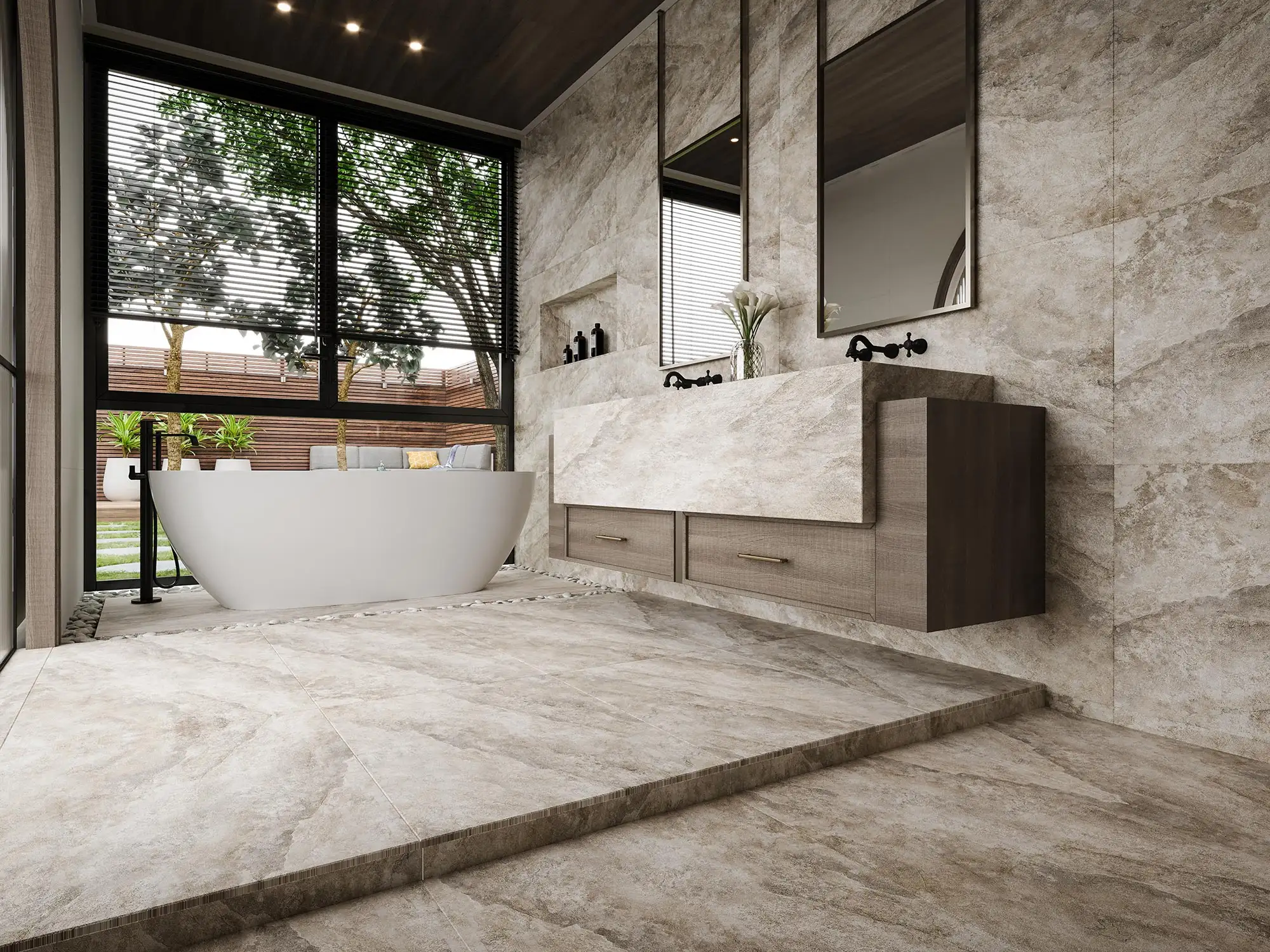 Our prestigious stone-effect tiles are perfect for enhancing your bedroom, inspired by the unique character of natural stone in all its forms. Our range of imitation stone tiles faithfully reproduces the appearance of this material, which has been considered a noble and charming material since the beginning of time.