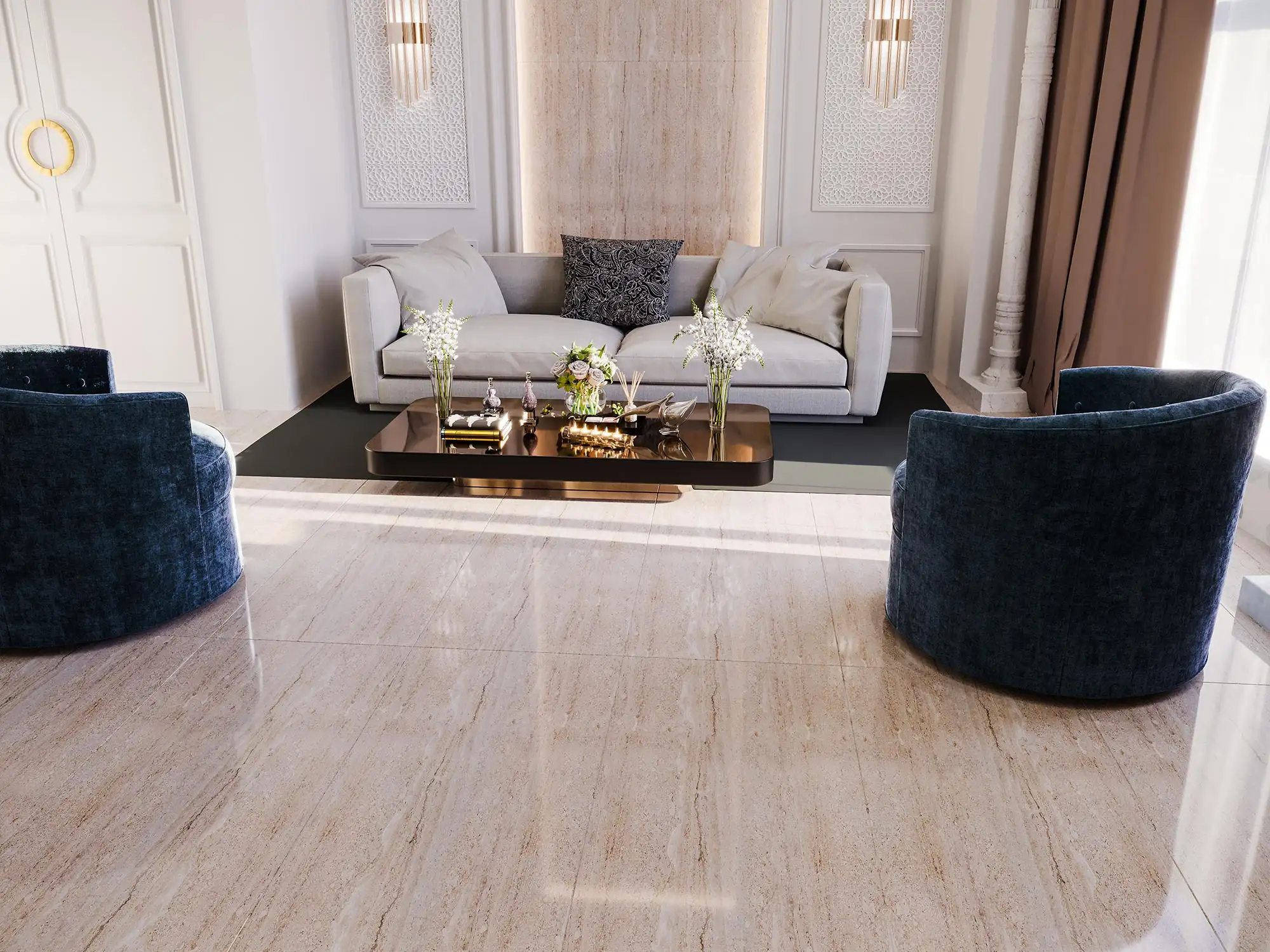 A streamlined decor for a majestic living room with character and warmth thanks to the strength of imitation marble tiles.